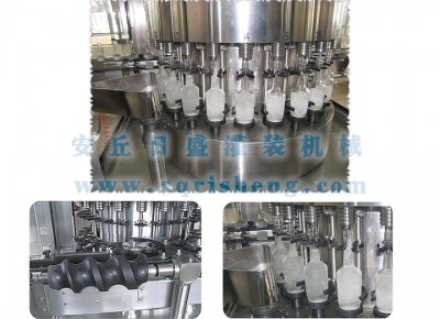 瓶子與灌裝閥上下方向不運(yùn)動(dòng),故障率極低:彈性定位夾同時(shí)卡住瓶身,瓶脖,使閥口瓶口準(zhǔn)確對(duì)中定位:高速液柱快速準(zhǔn)量灌裝、工作穩(wěn)定可靠。